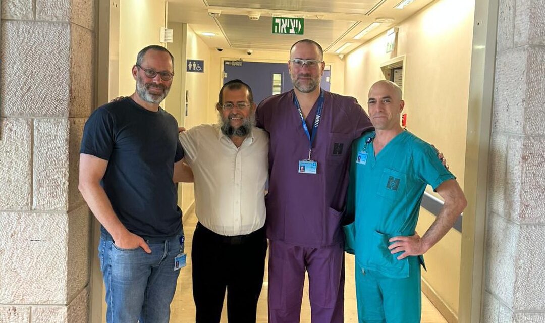 PHOTO: Gavriel Avitan (second left) with Prof. Uri Wald (left) and Drs. Ohad Einav (second right) and Gal Barkay (right) — part of the Hadassah team who got the 59-year-old back on his feet.