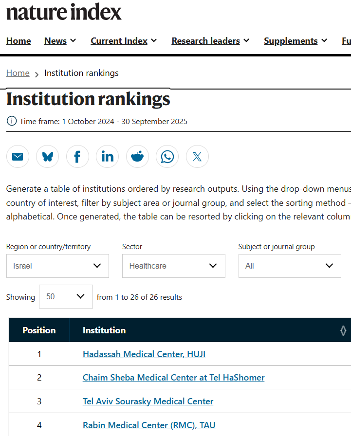 Said Eyal Mishani, PhD, head of the hospital system’s Research and Development Division, “Nature ranked the hospitals based on impact factors, such as what they’ve published, the number of times an article was quoted and how many online visits each received – all of the academic parameters that facilitate an assessment of a hospital’s scientific work.”